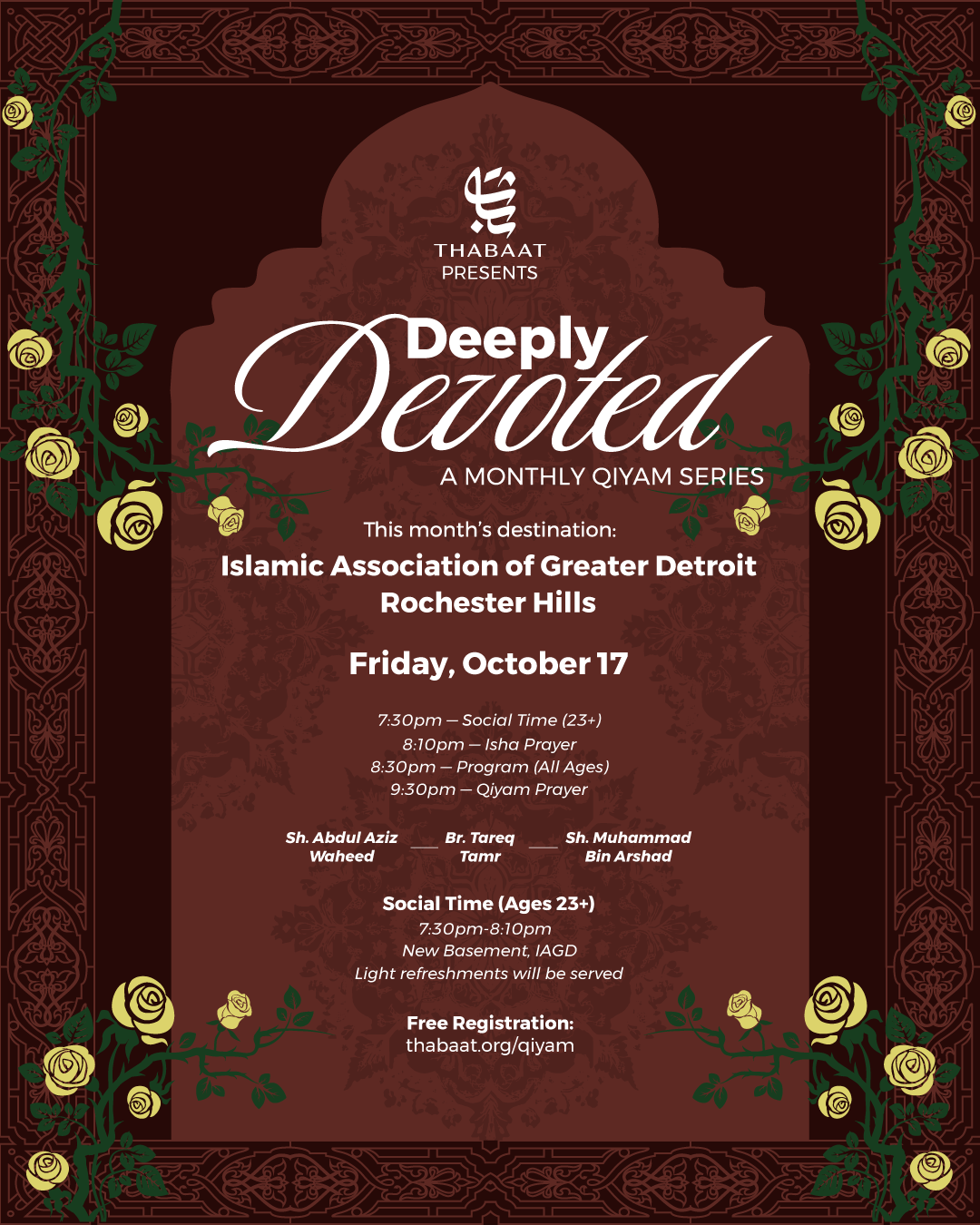 Each month, we explore a new masjid in Southeast Michigan - gathering for prayer, conversation, and spiritual reminders. These evenings are a chance to engage with new spaces, support local communities, and reconnect to our faith.